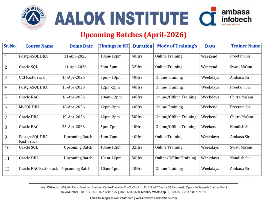 EXCELLENT Based on 684 reviews Posted on Aditya KambleTrustindex verifies that the original source of the review is Google. Sql faculty -tejas sir teaches so well explaining each concept and topics solve all our doubts and questions Also i sincerely thank Chitralekha mam and the aalok institute for their excellent guidance and support throughout the oracle DBA course. The teaching was clear, helpful, and made learning easy and solving every doubt as im from a non IT background. I highly recommend this institution for quality education.Posted on ROHIT BHATTTrustindex verifies that the original source of the review is Google. This is a great place for anyone who wants to build skills in Oracle DBA and grow in their career. I would definitely recommend these classes to others.Posted on Zahra AllaouiTrustindex verifies that the original source of the review is Google. I would also like to thank Sir Ambasa for the excellent Performance Tuning training. It was a very comprehensive and detailed course, covering many real-world scenarios that we can encounter in professional environments. The explanations were clear, practical, and supported by numerous examples, which made complex topics much easier to understand. This training provided valuable insights into database performance analysis and optimization, and it will certainly be very useful in real production environments. If it were possible to give more than five stars, I would do so without hesitation. Thank you again for this outstanding training experience.Posted on Ajay KambleTrustindex verifies that the original source of the review is Google. Superb teaching by ambasa sir for performance tuning and PostgreSql he is the god of dba every one should join aalok institution those who want to make carrier in PostgreSql oracle dba performance tuning ambassa sir teaching superbPosted on sajid shaikhTrustindex verifies that the original source of the review is Google. Very good expert level training you will get here fro Ambasa Sir, which will help you to take ownership of that technology after completion of course.Posted on Nikhil ArsekarTrustindex verifies that the original source of the review is Google. Five stars for Preetam Sir!! His PostgreSQL DBA course was exceptional. He have a rare ability to simplify complex database concepts—from architecture and indexing strategies to advanced backup and recovery scenarios. The sessions were practical, well-paced, and filled with real-world insights that go far beyond the standard documentation. He managed to make even the most 'dry' topics like vacuuming and lock contention engaging and easy to understand. If you’re looking to transition into database administration, this is the trainer you want in your corner. Truly an expert who knows how to teach!Posted on Ritesh AwalkarTrustindex verifies that the original source of the review is Google. I recently completed my Oracle SQL Fundamentals & Oracle DBA course at Aalok Institute, and my overall experience was very positive. The course structure was well planned and covered both theoretical concepts and practical knowledge, which helped me develop a strong understanding of SQL Fundamentals & Oracle Database Administration. I would like to especially thank my trainer, Nandish Sir, for his effective teaching style. He explained complex topics in a clear and easy manner, focused on concept clarity, and shared practical examples that were useful for real-world applicationsPosted on Pawan SonoleTrustindex verifies that the original source of the review is Google. Very good faculty and the course details are explained in detailed.